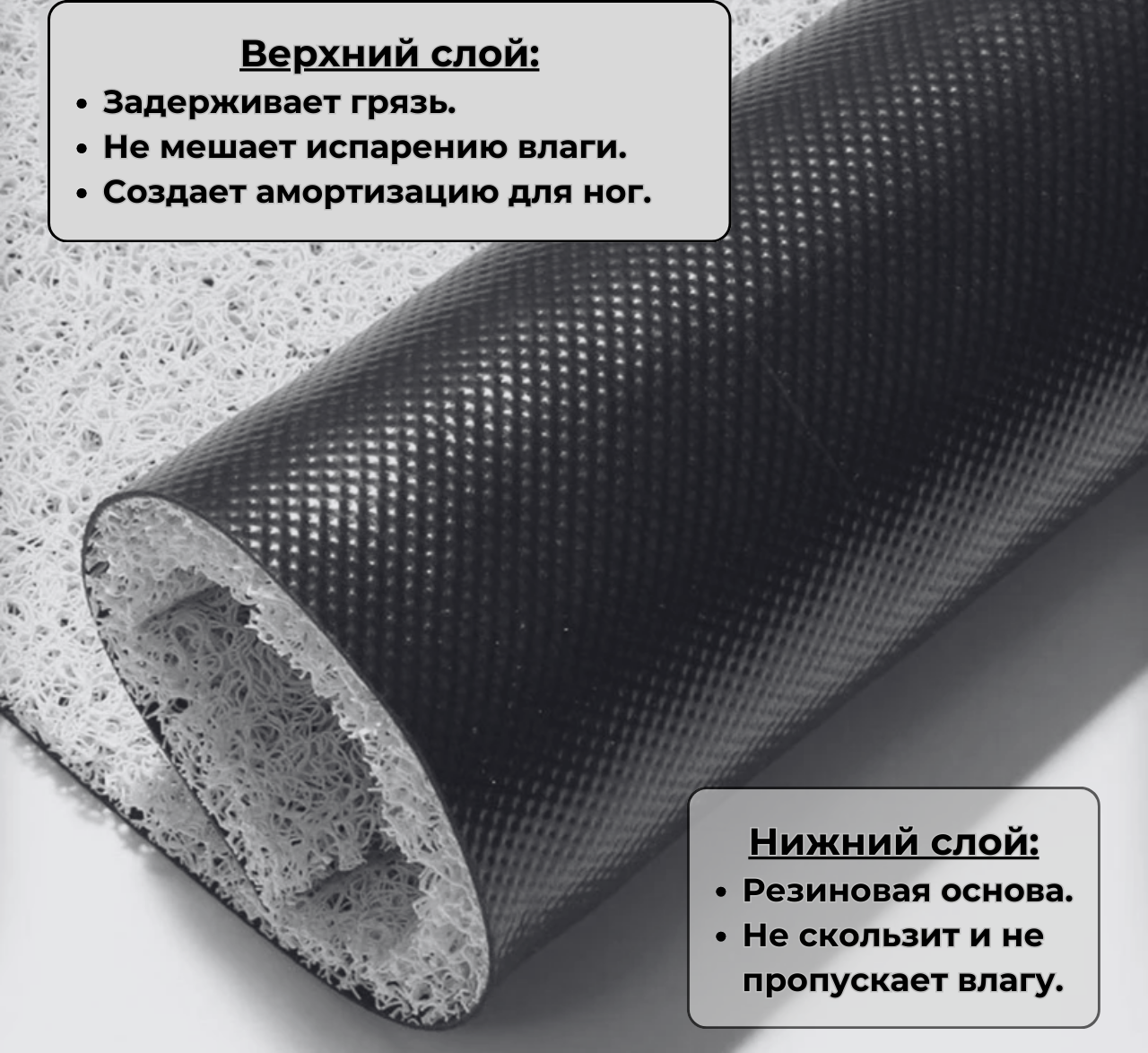 • Структура ковра - много-много ПВХ нитей, которые переплетаются между собой. Это позволяет задерживать мелкие камешки и мусор, который прилип к вашей подошве на улице. Вся грязь, песок и камни задерживаются внутри коврика и не разносятся по дому.⠀